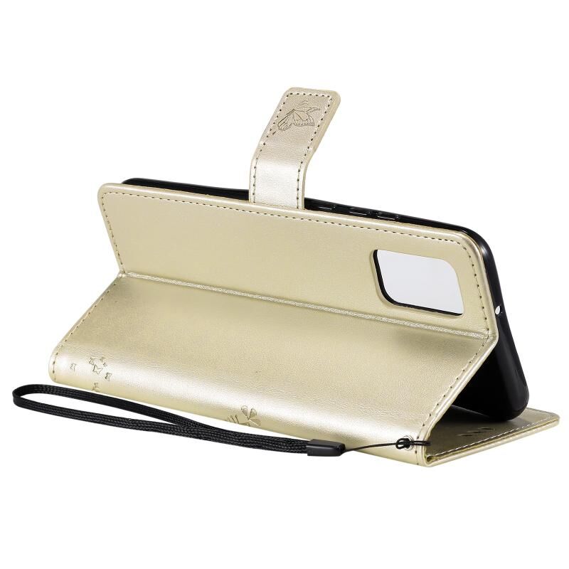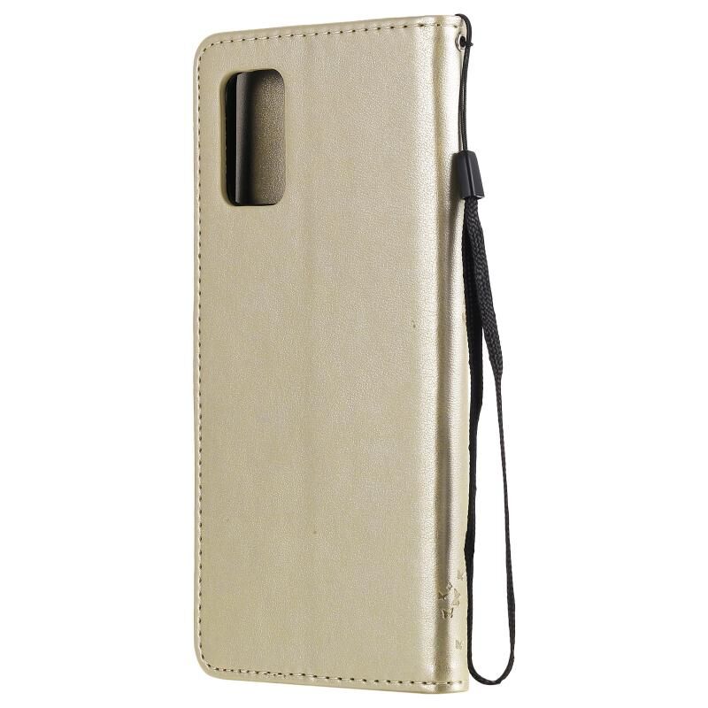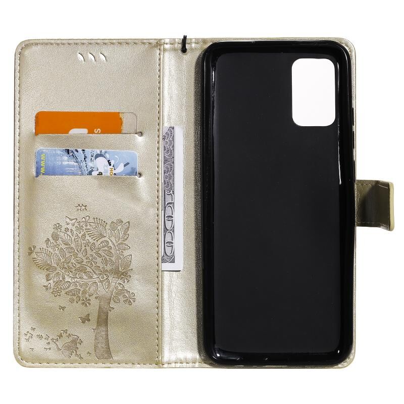 Για Samsung Galaxy A02s Δέντρο & Γάτα μοτίβο πιεσμένη εκτύπωση οριζόντια Flip PU δέρμα υπόθεση με θήκη & υποδοχές για κάρτες & πορτοφόλι & κορδόνι (χρυσό)