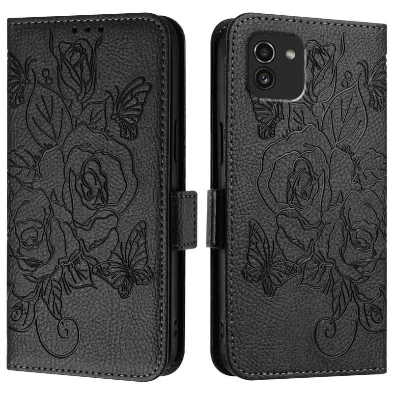 Για Samsung Galaxy A03 164mm ανάγλυφο Rose RFID Anti-theft δερμάτινη θήκη τηλεφώνου (Μαύρο)