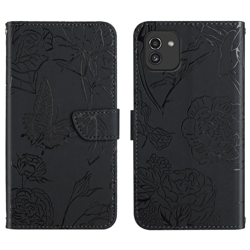 Θήκη τηλεφώνου Samsung Galaxy A03 164mm με ανάγλυφο δέρμα, αίσθηση δέρματος, σχέδιο πεταλούδας και παιώνιας (Κόκκινο)