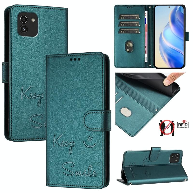 Για Samsung Galaxy A03 164mm Χαμόγελο ανάγλυφο RFID δερμάτινη θήκη τηλεφώνου (Πράσινο παγώνι)