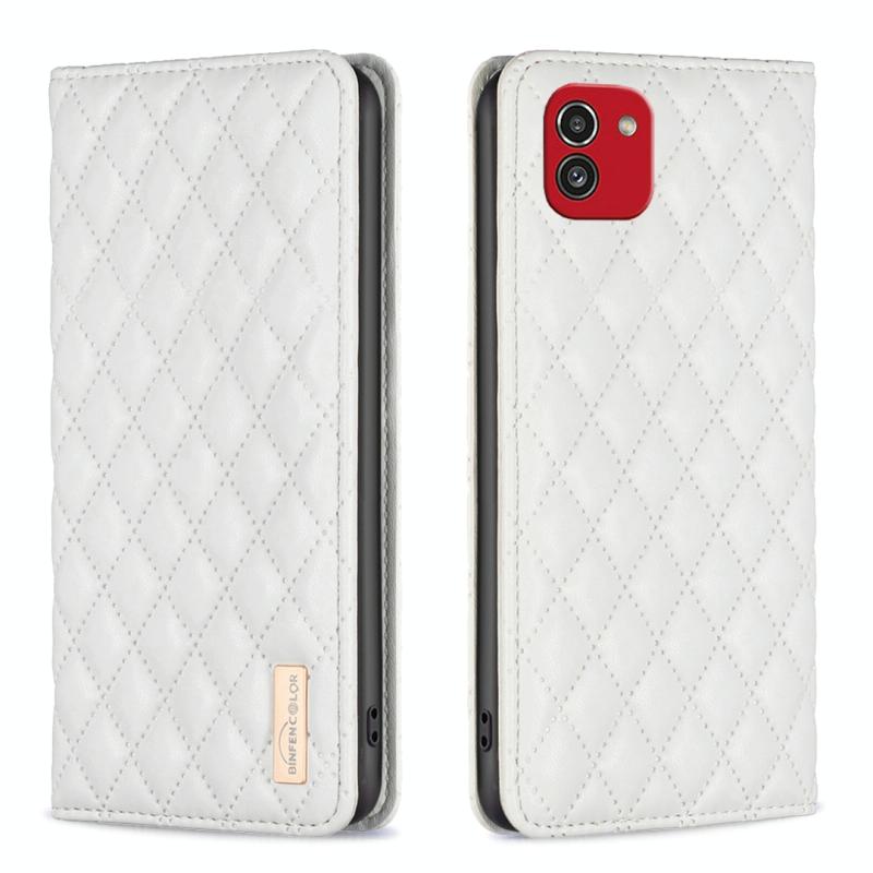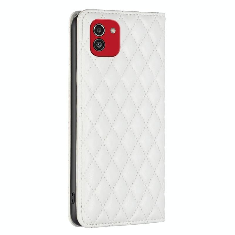 Θήκη τηλεφώνου Samsung Galaxy A03 166mm, Δερμάτινη, Πτυσσόμενη, με Μαγνητικό Κλείσιμο και Διαμαντένιο Δίκτυο (Λευκό)