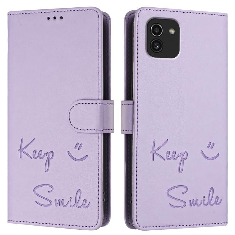 Για Samsung Galaxy A03 166mm Χαμόγελο ανάγλυφο RFID δερμάτινη θήκη τηλεφώνου (Light Purple)