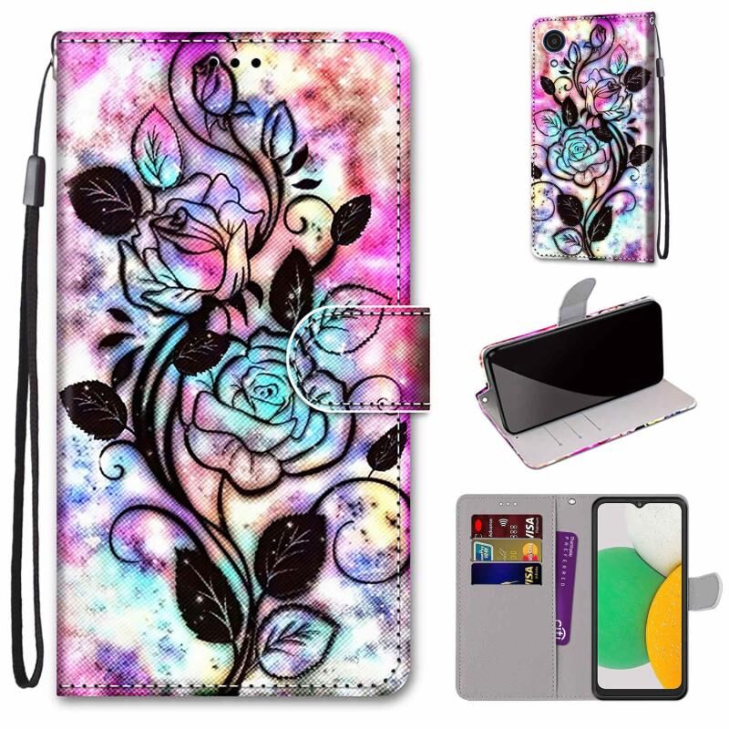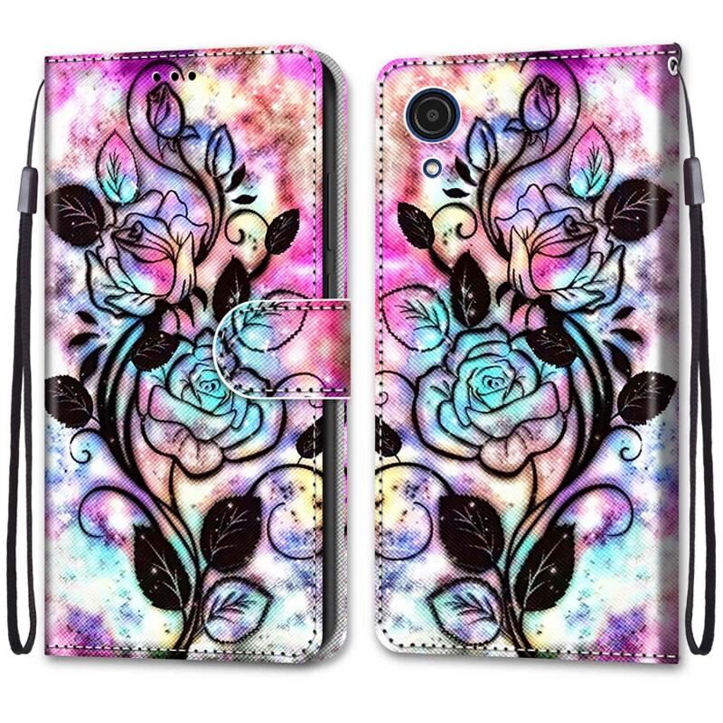 Θήκη τηλεφώνου Samsung Galaxy A03 Core από δέρμα με οριζόντιο άνοιγμα, πολύχρωμο σχέδιο, ανάγλυφη υφή, με βάση, θήκες καρτών, πορτοφόλι και κορδόνι (Ροζ Λουλούδια - Πύργος της Γέφυρας).