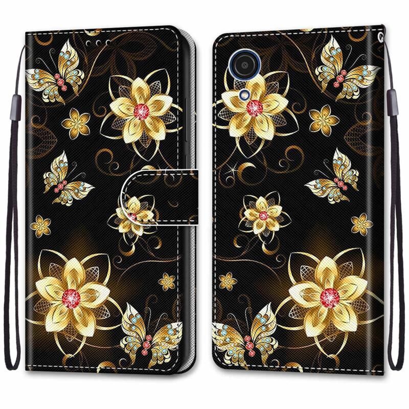 Θήκη τηλεφώνου Samsung Galaxy A03 Core από δέρμα με οριζόντιο άνοιγμα, πολύχρωμο σχέδιο, ανάγλυφη υφή, με βάση, θήκες καρτών, πορτοφόλι και κορδόνι (Ροζ Λουλούδια - Πύργος της Γέφυρας).
