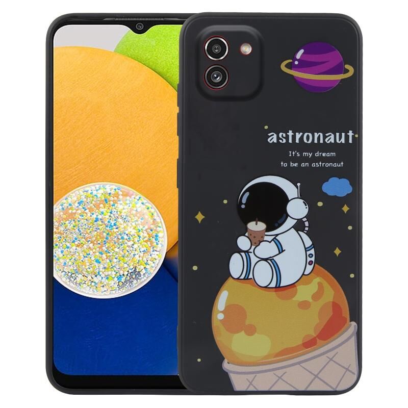 Θήκη τηλεφώνου υγρής σιλικόνης για Samsung Galaxy A03, σχέδιο αστροναύτη με γάλα τσαγιού (Μαύρο)