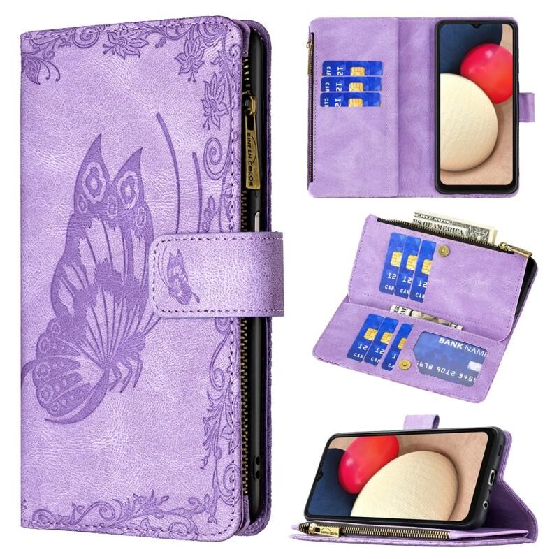 Για Samsung Galaxy A03s 164mm Flying πεταλούδα ανάγλυφο μοτίβο φερμουάρ οριζόντια Flip δερμάτινη θήκη με κάτοχο & υποδοχές για κάρτες & πορτοφόλι (μωβ)