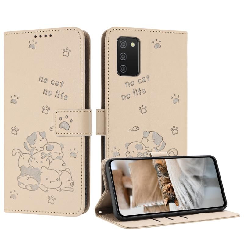 Θήκη δερμάτινη για Samsung Galaxy A03s 166mm με ανάγλυφο γατάκι και κορδόνι (Μπεζ)