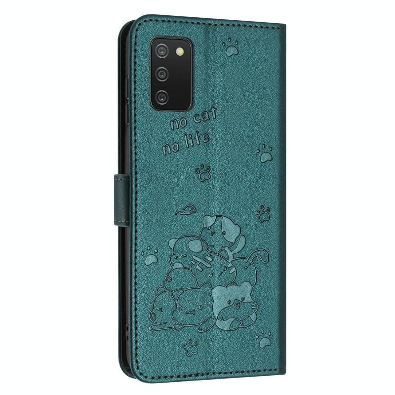 Θήκη δερμάτινη για Samsung Galaxy A03s 166mm με ανάγλυφο γατάκι και κορδόνι (Σκούρο πράσινο)