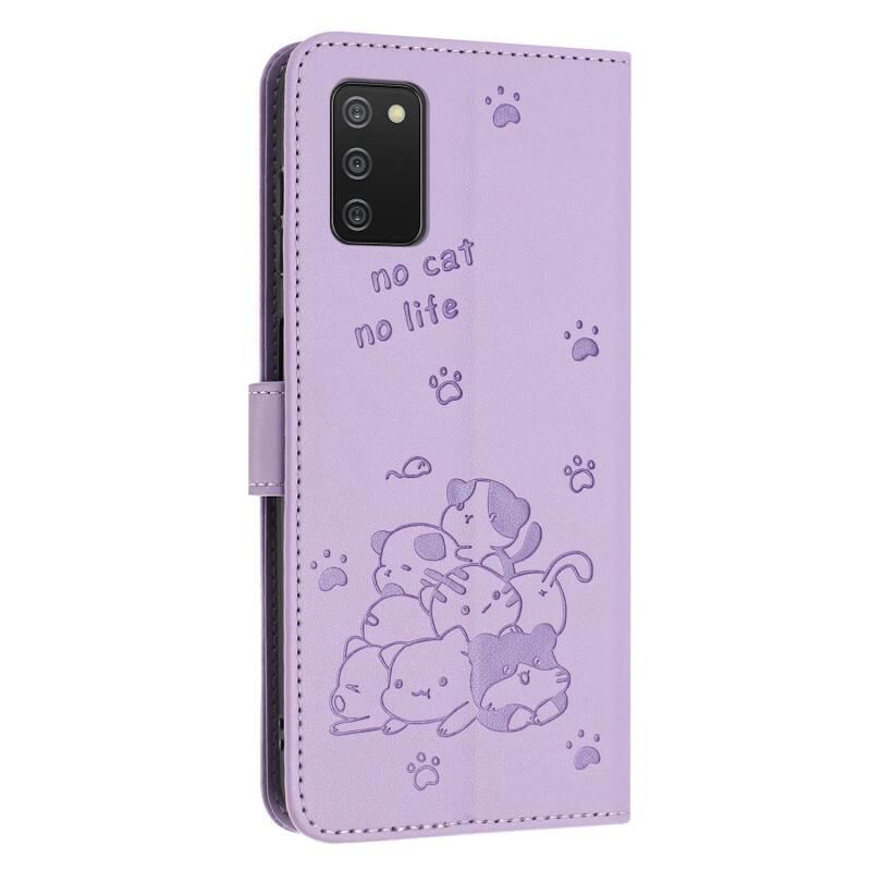 Θήκη δερμάτινη για Samsung Galaxy A03s 166mm με ανάγλυφο γατάκι και κορδόνι (Μωβ)