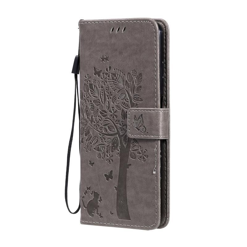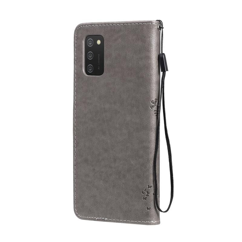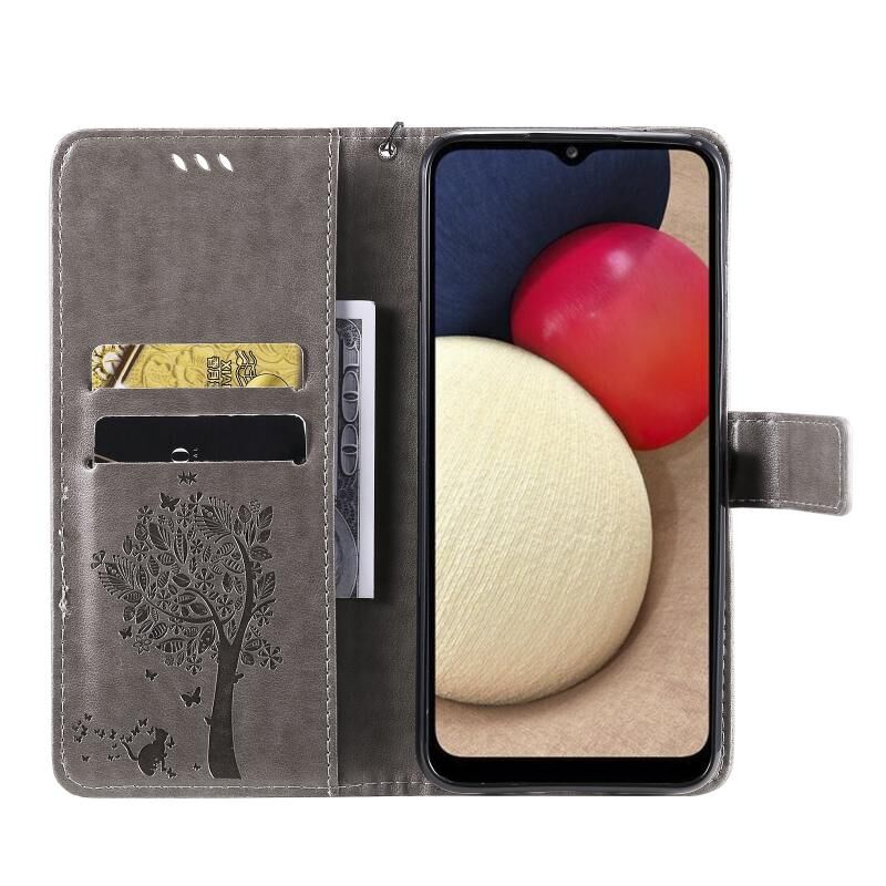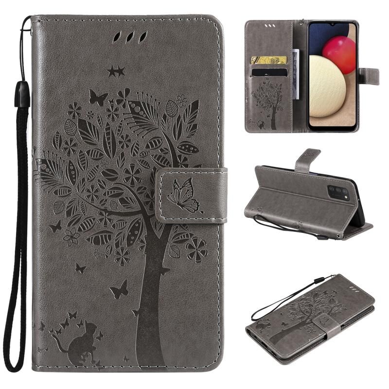 Θήκη Samsung Galaxy A03s 166mm με σχέδιο Δέντρου & Γάτας, εκτυπωμένη με θερμοτύπηση, οριζόντια, από δερματίνη PU με βάση στήριξης & θήκες για κάρτες & πορτοφόλι & κορδόνι (Γκρι)