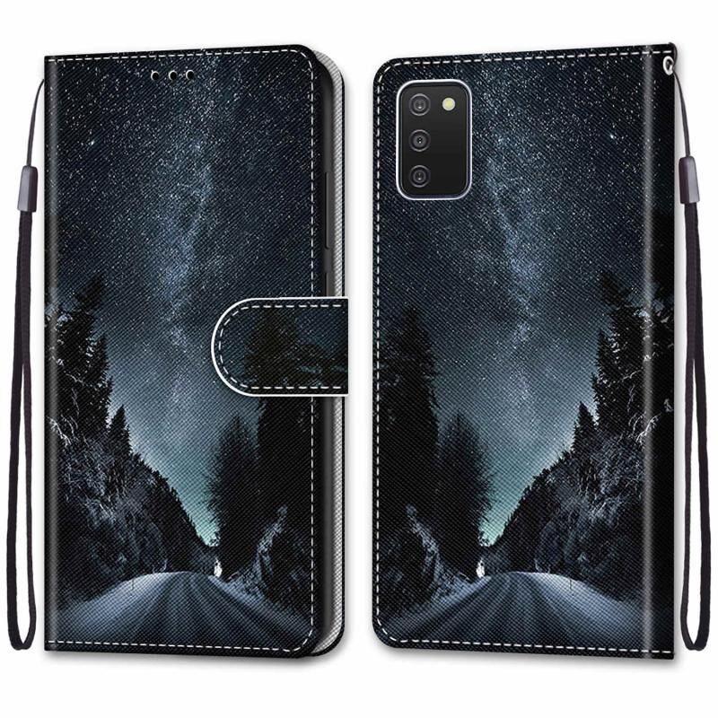 Θήκη τηλεφώνου δέρματος οριζόντιας αναδίπλωσης για Samsung Galaxy A03s 166mm με σχέδιο πολύχρωμης ζωγραφικής, υφή σταυρού, με βάση στήριξης & θήκες καρτών & πορτοφόλι & κορδόνι (Ορεινός Δρόμος Αστρικός Ουρανός)