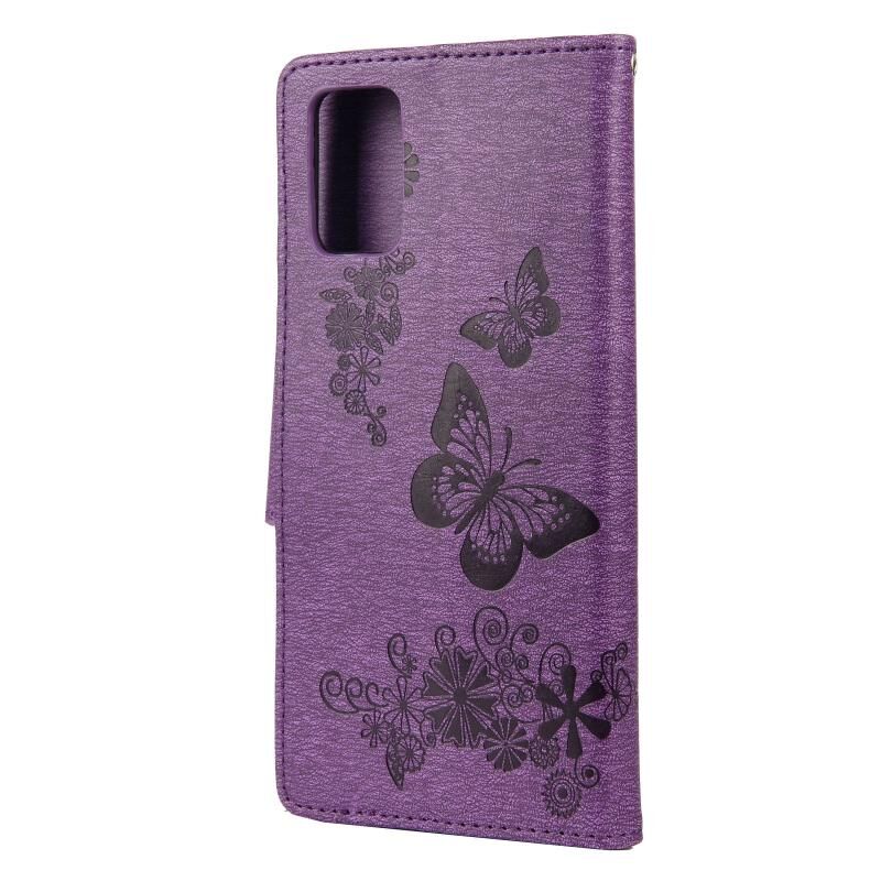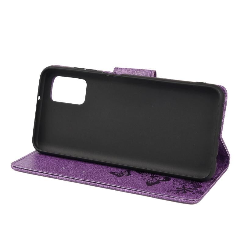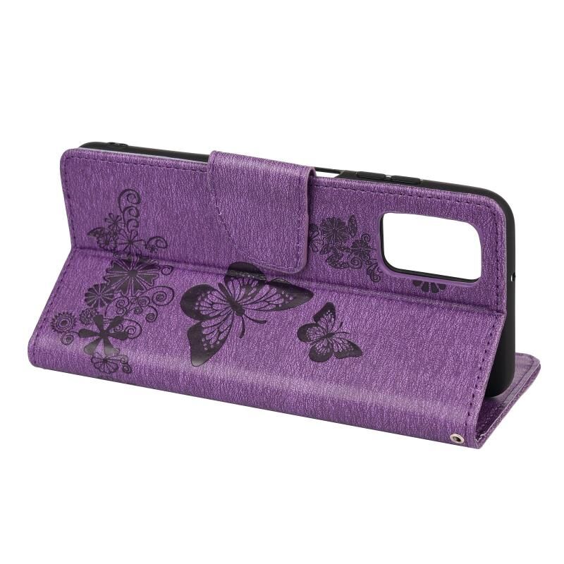 Θήκη Samsung Galaxy A03s 166mm, vintage, ανάγλυφο λουλουδάτο σχέδιο με πεταλούδες, οριζόντια, δερμάτινη με θήκη για κάρτες, στήριξη, πορτοφόλι & λουρί (Μωβ)