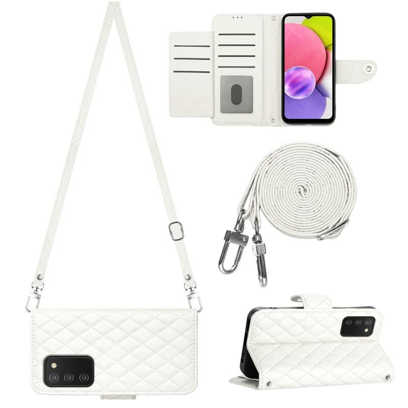 Για Samsung Galaxy A03s ΕΕ Ρομβική υφή Flip δερμάτινη θήκη τηλεφώνου με μακρύ κορδόνι (λευκό)