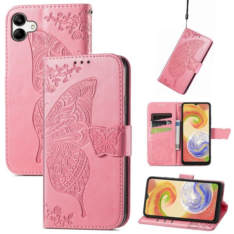 Θήκη τηλεφώνου Samsung Galaxy A04 με ανάγλυφο σχέδιο πεταλούδας, λουλουδιών και δέρμα (Χρυσό ροζ)