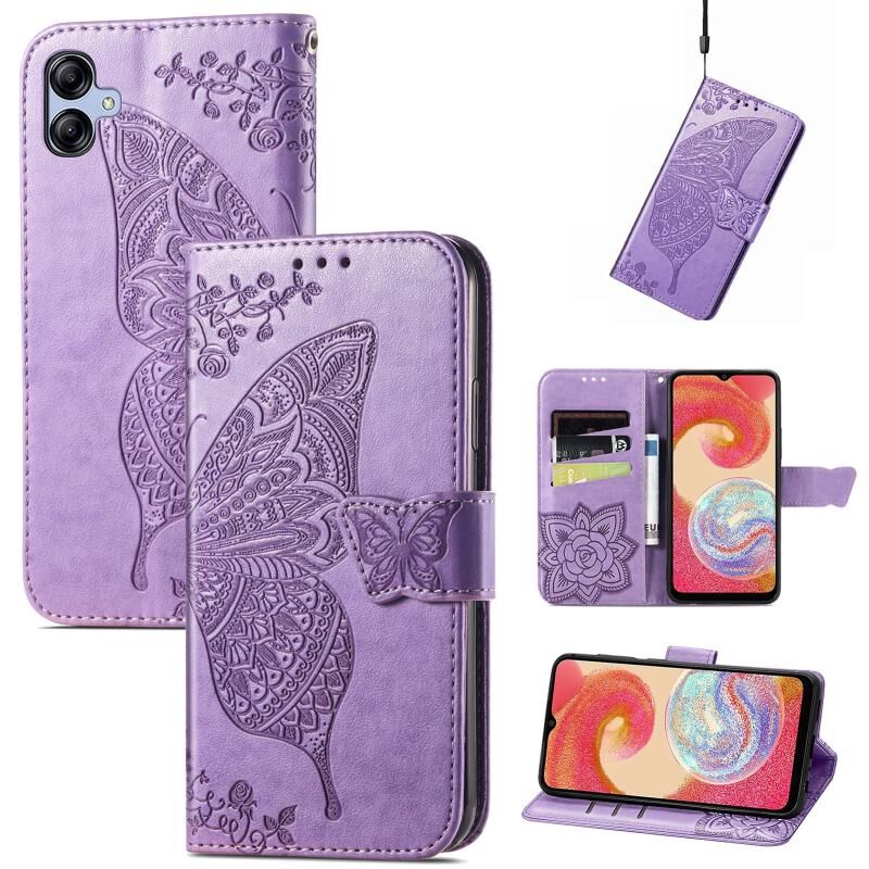 Θήκη τηλεφώνου Samsung Galaxy A04e / F04 / M04 με ανάγλυφο σχέδιο πεταλούδας και λουλουδιών, δερμάτινη, τύπου flip (Μαύρο)