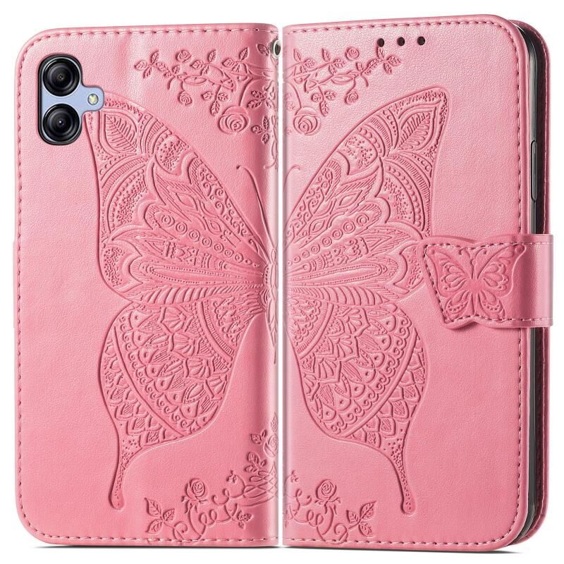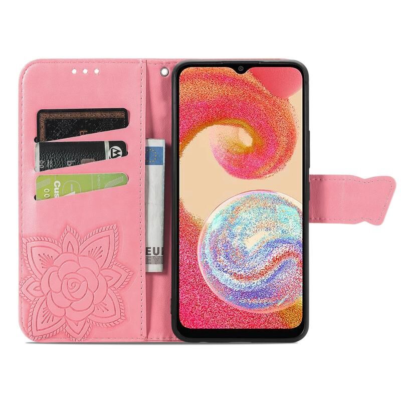Θήκη τηλεφώνου Samsung Galaxy A04e / F04 / M04 με ανάγλυφο σχέδιο πεταλούδας και λουλουδιών, δερμάτινη, τύπου flip (Μαύρο)