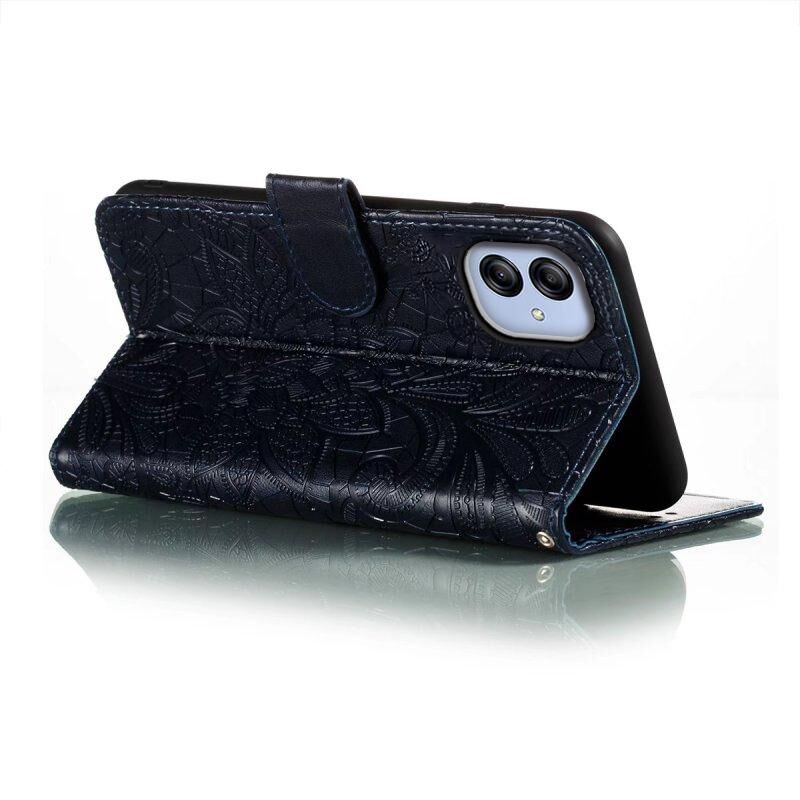 Για Samsung Galaxy A04e Lace λουλούδι ανάγλυφο Flip υπόθεση τηλεφώνου δέρμα (σκούρο μπλε)