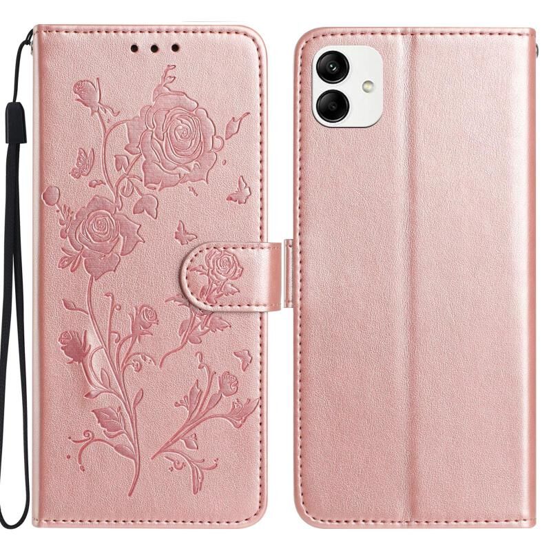 Θήκη τηλεφώνου δερμάτινη με ανάγλυφο σχέδιο ροζ άνθους για Samsung Galaxy A04e (Χρυσό Ροζ)