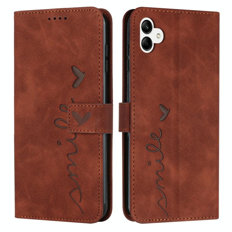 Θήκη κινητού Samsung Galaxy A04e με υφή δέρματος, ανάγλυφο σχέδιο καρδιάς και κορδόνι (Καφέ)