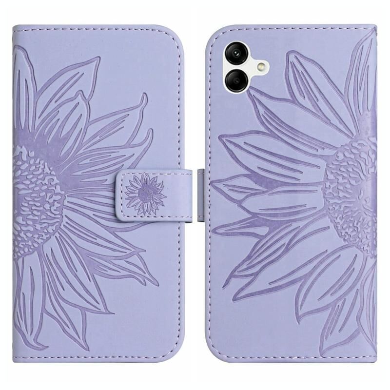 Για το Samsung Galaxy A04E δέρμα αίσθηση Sun Flower μοτίβο Flip δέρμα τηλέφωνο υπόθεση με κορδόνι (Μωβ)