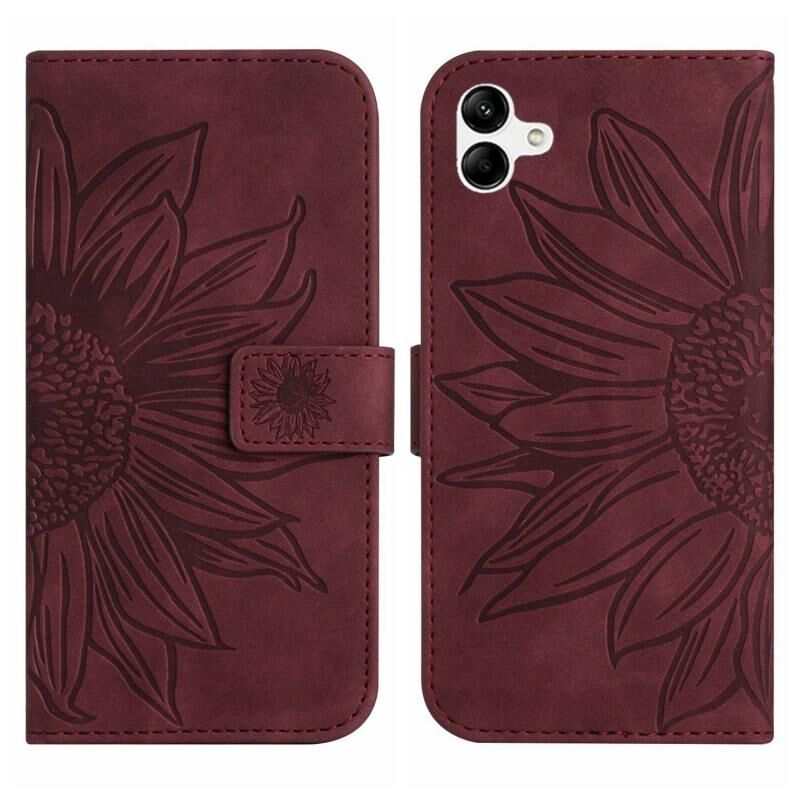 Για το Samsung Galaxy A04E δέρμα αίσθηση Sun Flower μοτίβο Flip δέρμα τηλέφωνο υπόθεση με κορδόνι (Κρασοκόκκινο)