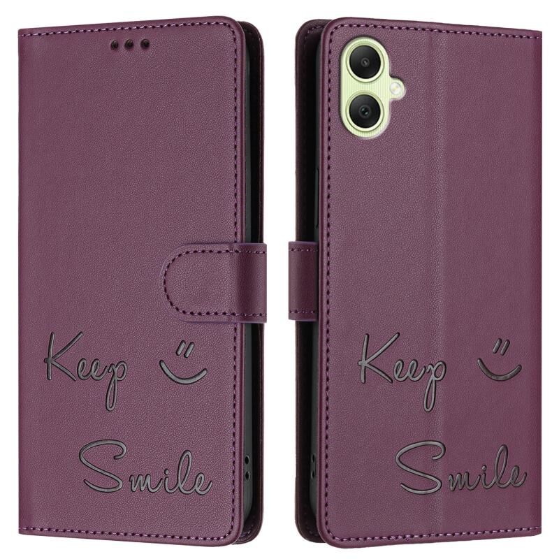 Για Samsung Galaxy A05 4G Παγκόσμια χαμόγελο ανάγλυφο RFID δερμάτινη θήκη τηλεφώνου (Violet)