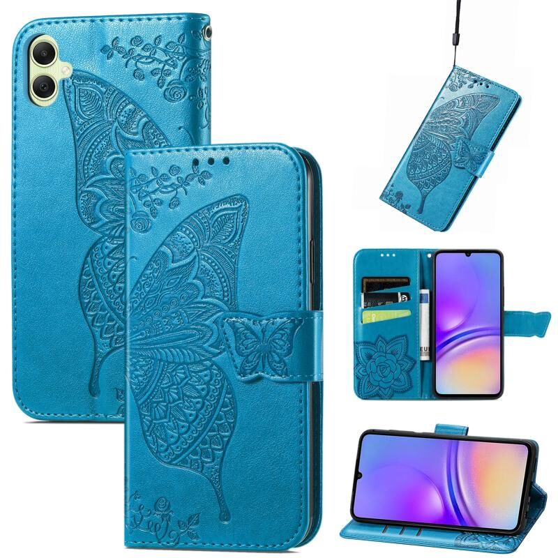 Για Samsung Galaxy A05 πεταλούδα αγάπη λουλούδι ανάγλυφο δερμάτινη θήκη τηλεφώνου (Μπλε)