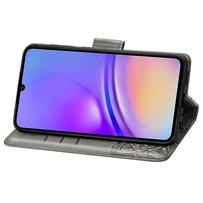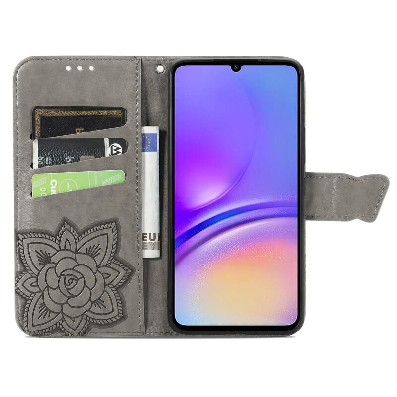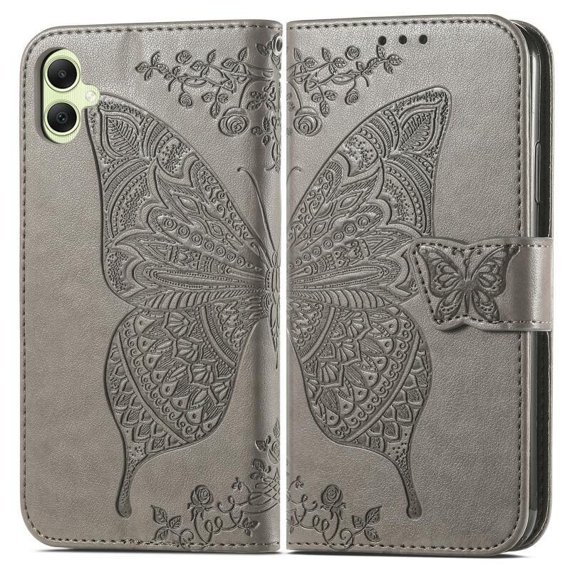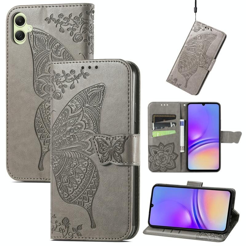 Για Samsung Galaxy A05 πεταλούδα αγάπη λουλούδι ανάγλυφο δερμάτινη θήκη τηλεφώνου (Γκρι)