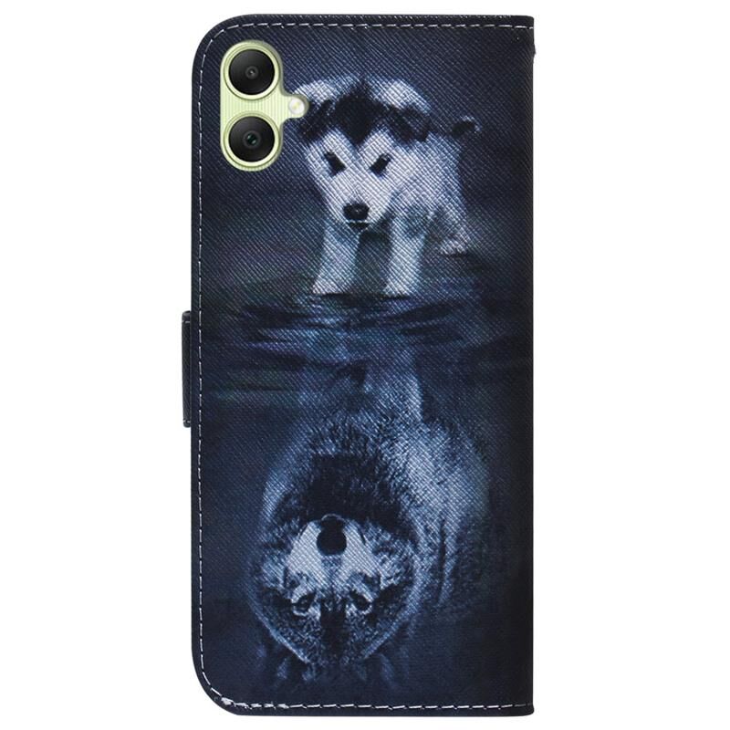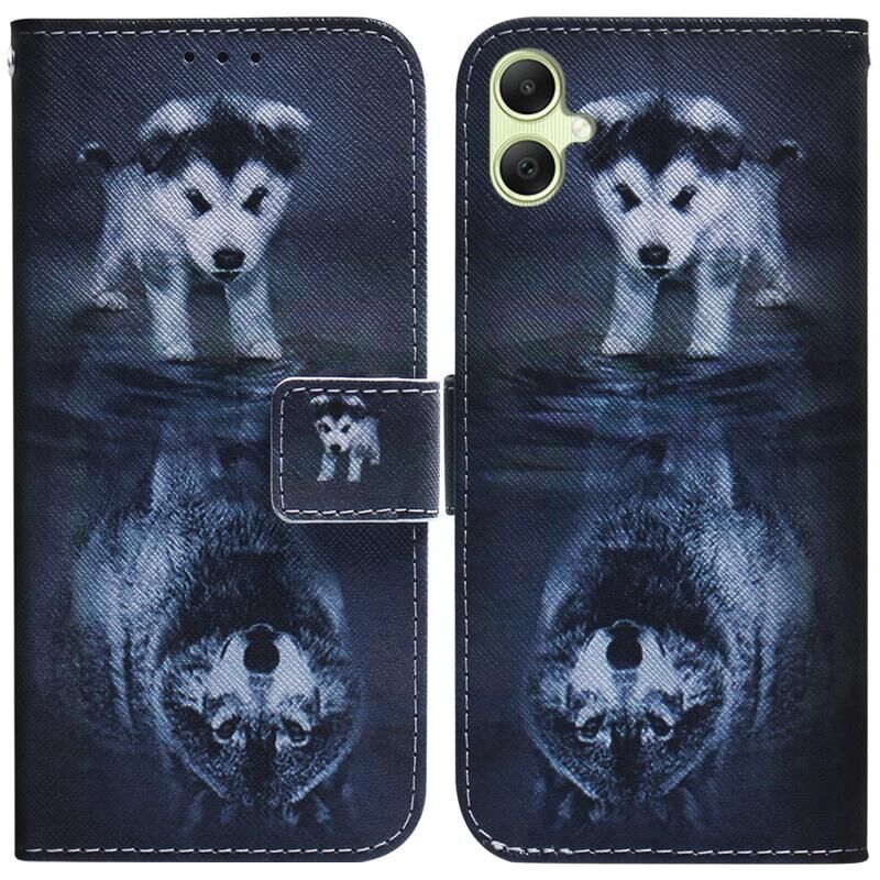 Θήκη τηλεφώνου Samsung Galaxy A05 με σχέδιο λουλουδιών, δερμάτινη, αναδιπλούμενη (Λύκος και Σκύλος)