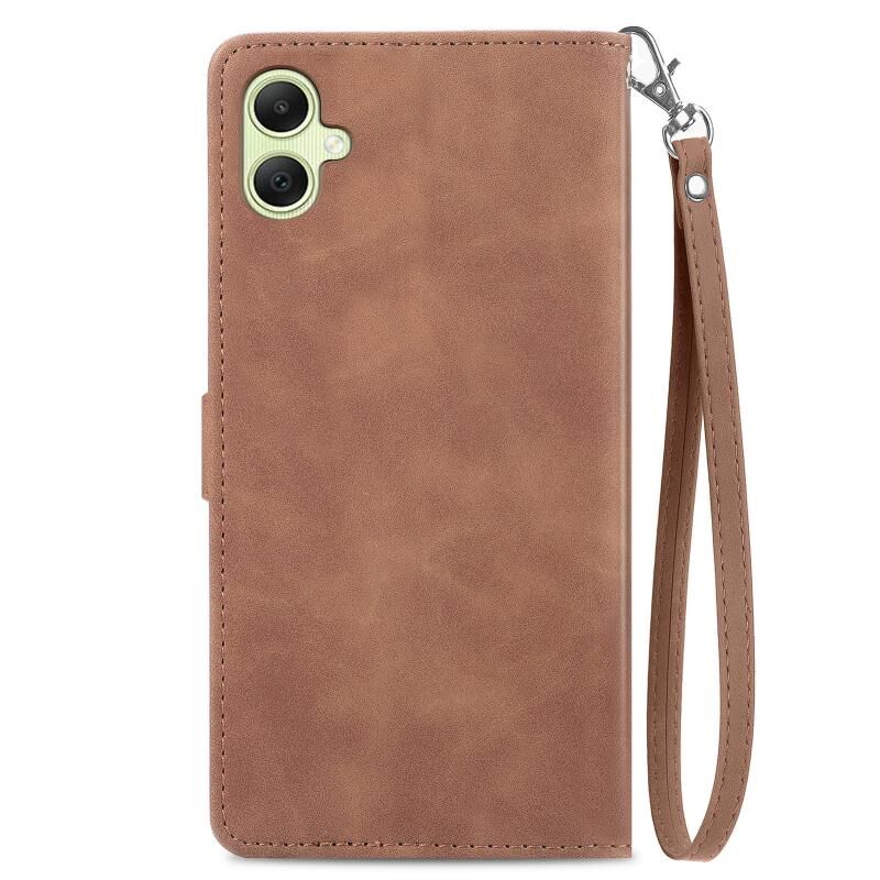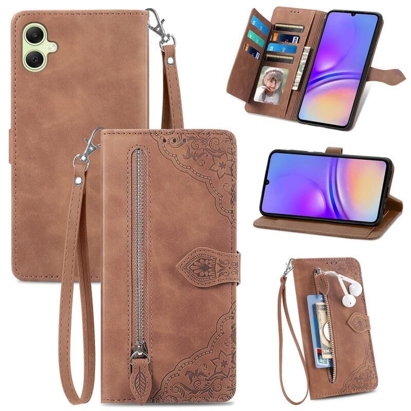 Για Samsung Galaxy A05 ανάγλυφο λουλούδι φερμουάρ δερμάτινη θήκη τηλεφώνου (καφέ)