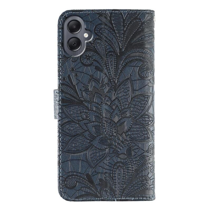 Θήκη τηλεφώνου Samsung Galaxy A05, δερμάτινη, τύπου flip, με ανάγλυφο σχέδιο δαντέλας λουλουδιών (Γκρι)
