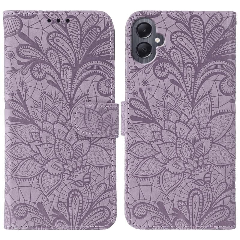 Θήκη τηλεφώνου Samsung Galaxy A05, δερμάτινη, τύπου flip, με ανάγλυφο σχέδιο δαντέλας λουλουδιών (Γκρι)