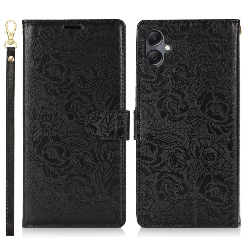 For Samsung Galaxy A05 Peony Flowers Imprint Leather Phone Case(Black)