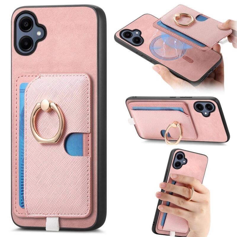 Θήκη κινητού Samsung Galaxy A05 Retro Cross από δέρμα με ενσωματωμένη δακτύλιο και θήκη καρτών στο πλάι, συμβατή με MagSafe (Ροζ)