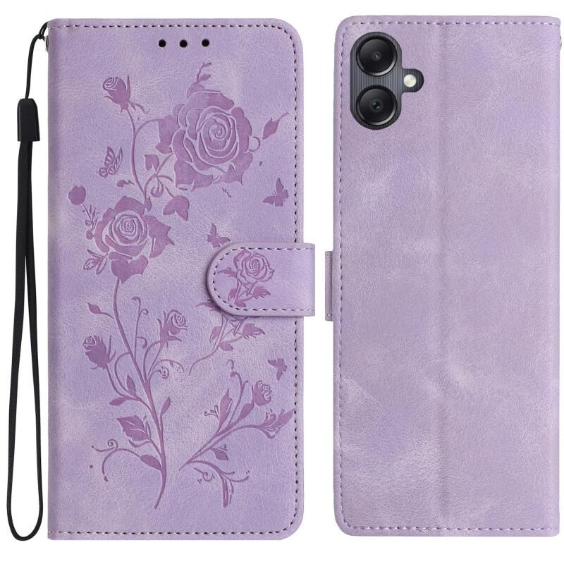 Θήκη τηλεφώνου δερμάτινη με ανάγλυφο σχέδιο ροζ άνθους για Samsung Galaxy A05 (ανοιχτό μωβ)