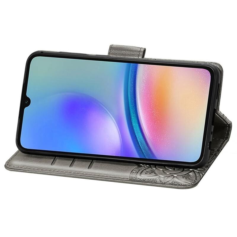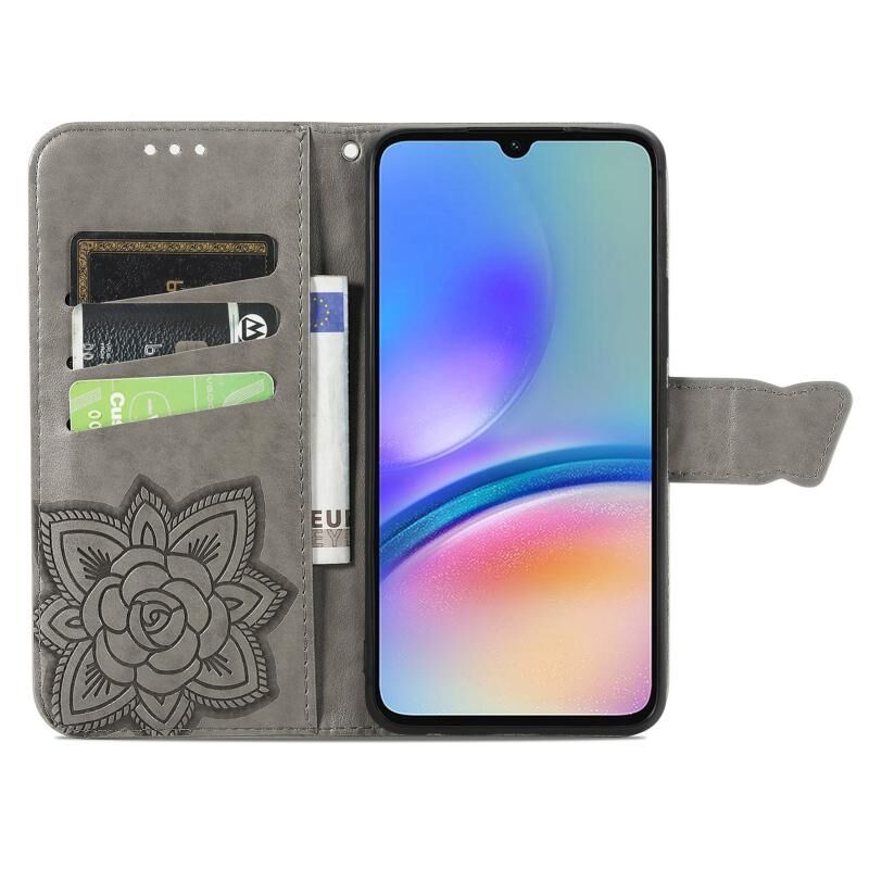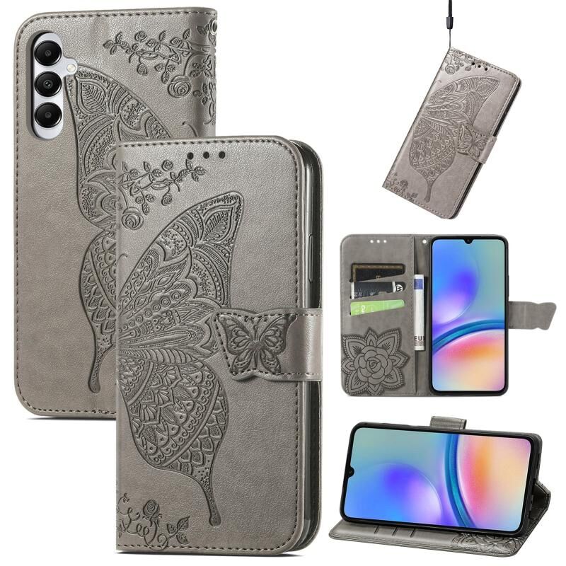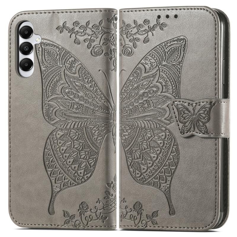 Για Samsung Galaxy A05s πεταλούδα αγάπη λουλούδι ανάγλυφο δερμάτινη θήκη τηλεφώνου (Γκρι)
