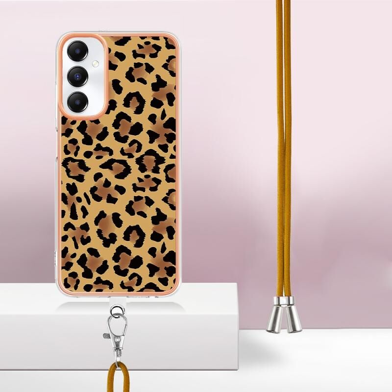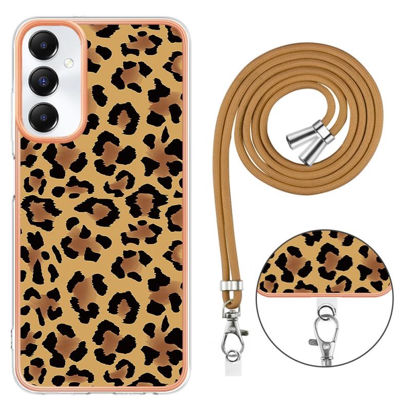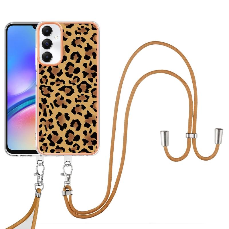 For Samsung Galaxy A05s Electroplating Dual-side IMD Phone Case with Lanyard(Leopard Print)