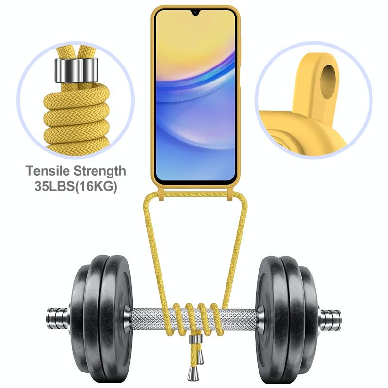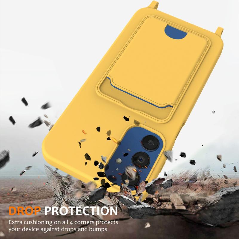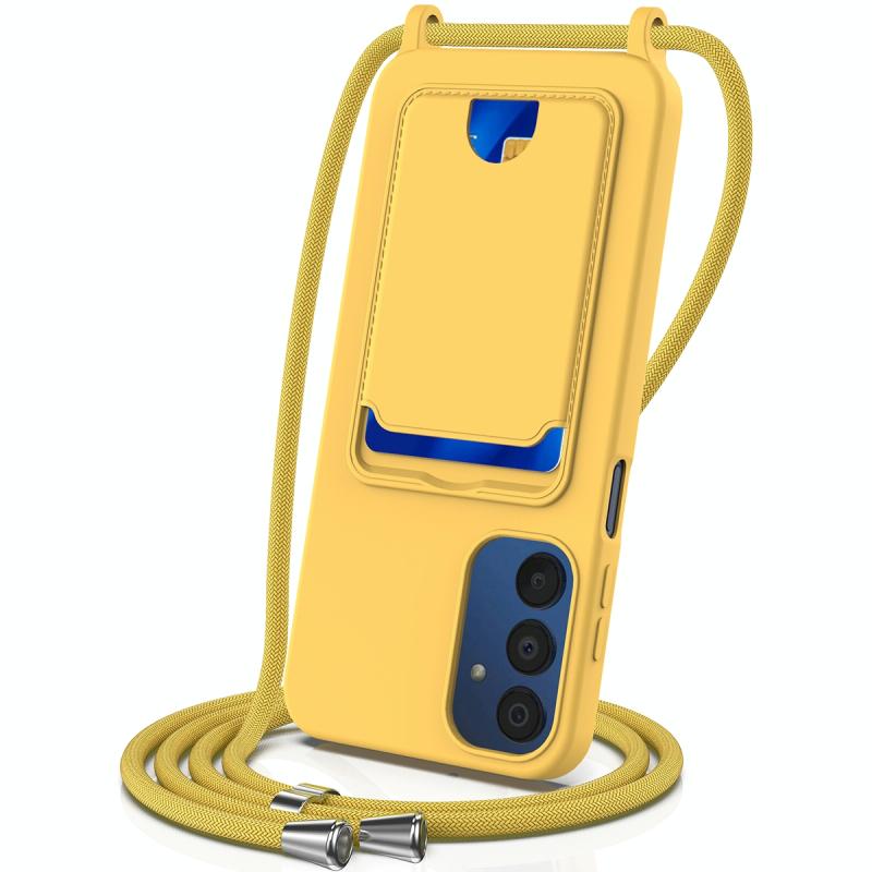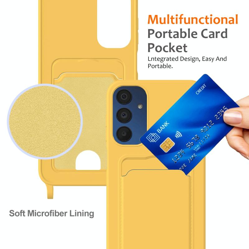 For Samsung Galaxy A05s Integrated Card Bag Solid Color Liquid Silicone Phone Case with Lanyard(Yellow)