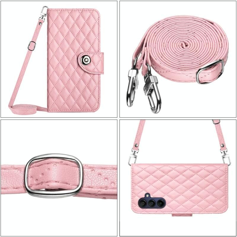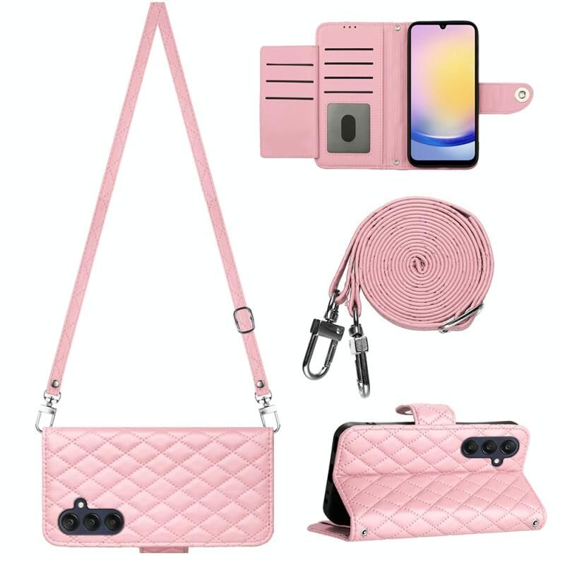 Για Samsung Galaxy A05s Rhombic υφή Flip δερμάτινη θήκη τηλεφώνου με μακρύ κορδόνι (ροζ)