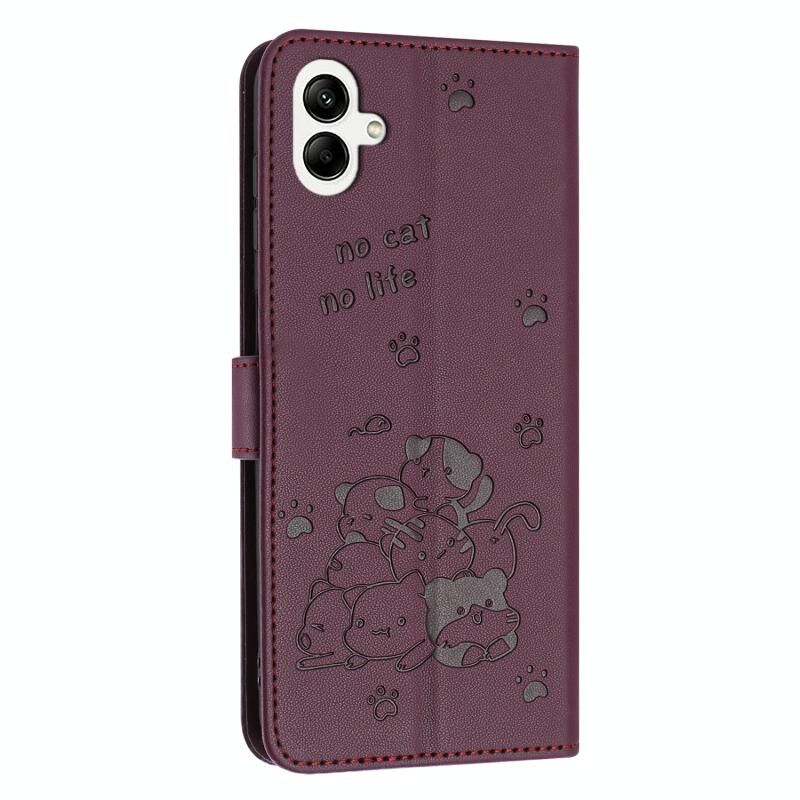Θήκη δερμάτινη για Samsung Galaxy A06 4G με ανάγλυφο γατάκι και κορδόνι (Μωβ)