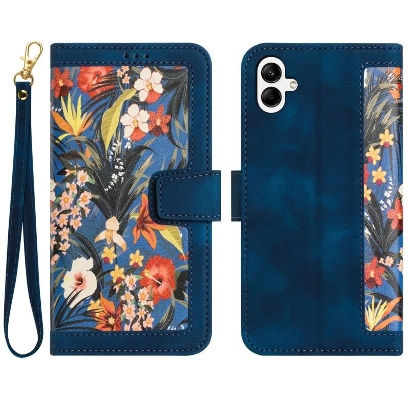 Θήκη τηλεφώνου Samsung Galaxy A06 4G με λουλουδάτο σχέδιο και δερμάτινη υφή, με κορδόνι (Ανοιχτό Μπλε)