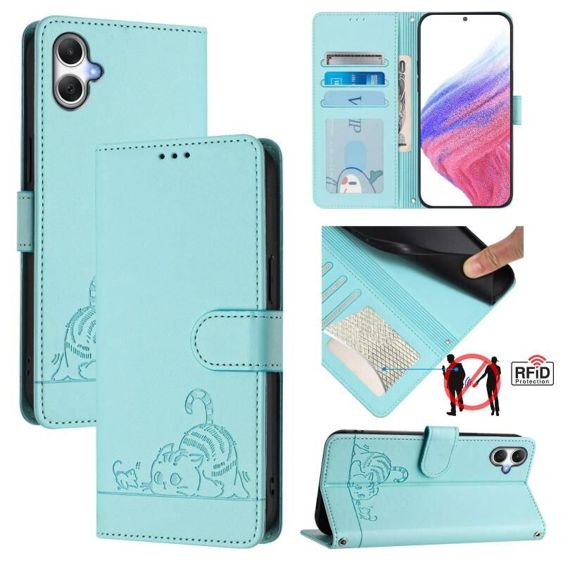Θήκη τηλεφώνου Samsung Galaxy A06 5G από δέρμα με ανάγλυφο σχέδιο γάτας και ποντικιού, με κορδόνι (Μέντας Πράσινο)