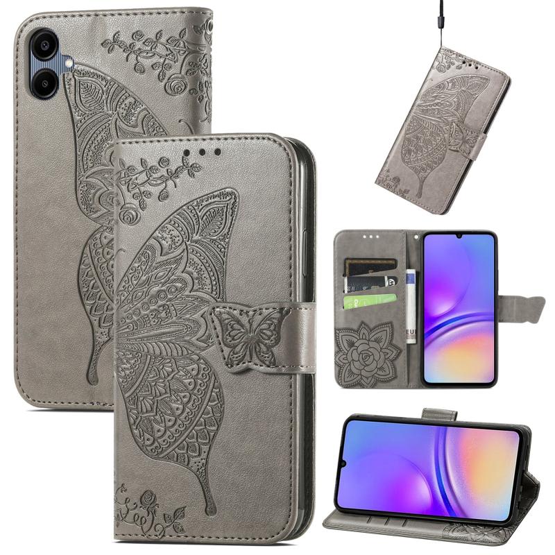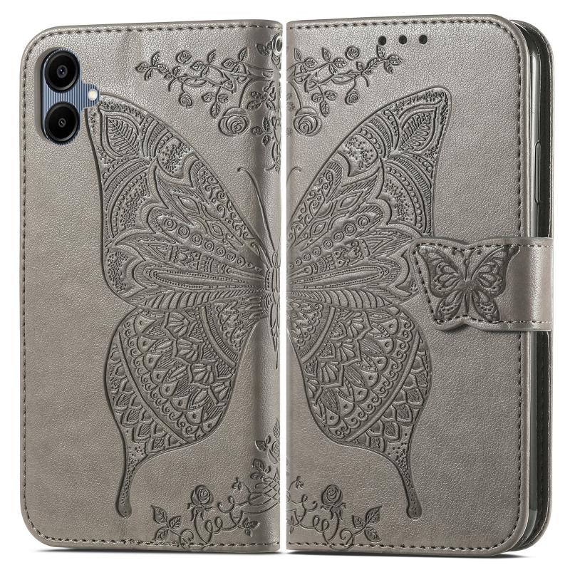 For Samsung Galaxy A06 Butterfly Love Flower Embossed Leather Phone Case(Gray)