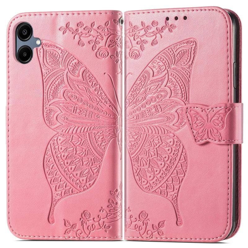 Θήκη τηλεφώνου Samsung Galaxy A06 με ανάγλυφο σχέδιο πεταλούδας και λουλουδιών από δέρμα (ρόζ)