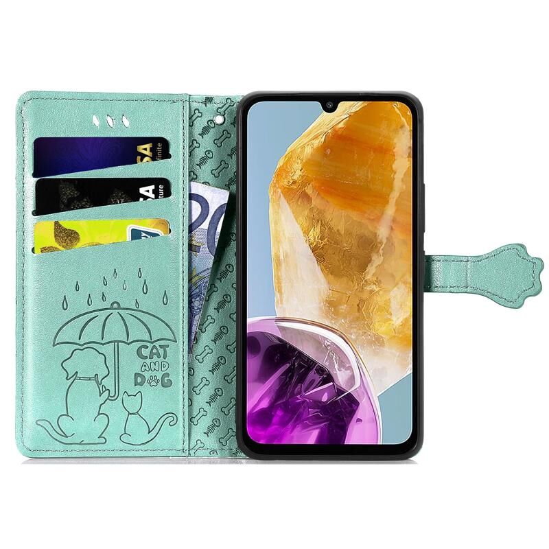 Θήκη τηλεφώνου Samsung Galaxy A06 με ανάγλυφο σχέδιο γάτας και σκύλου από δέρμα (Μωβ)