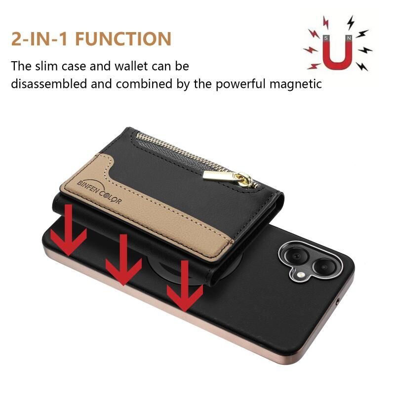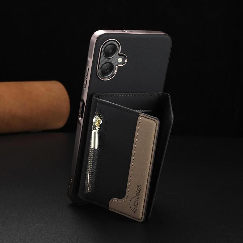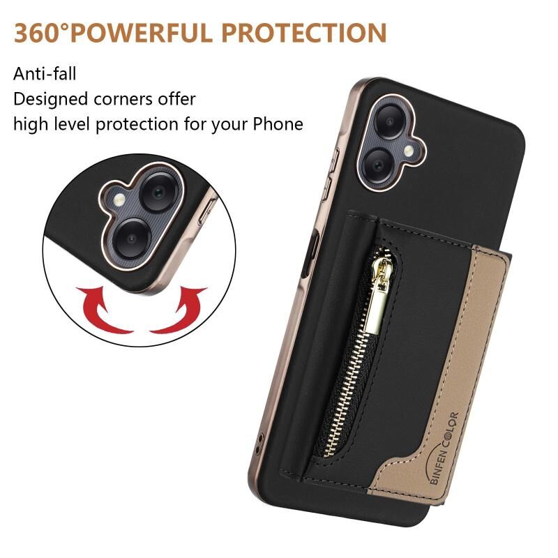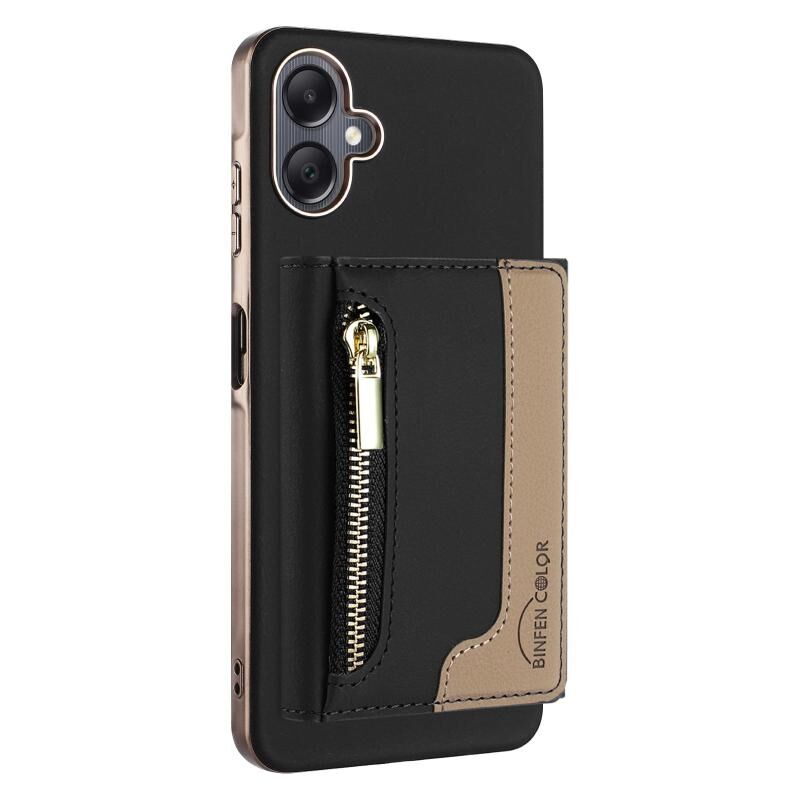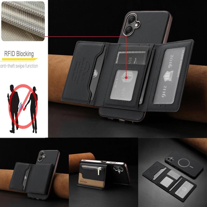 Θήκη κινητού τηλεφώνου Samsung Galaxy A06 με μαγνητικό κλείσιμο, οριζόντια τσέπη για κάρτες με φερμουάρ, RFID & MagSafe (Μαύρο)