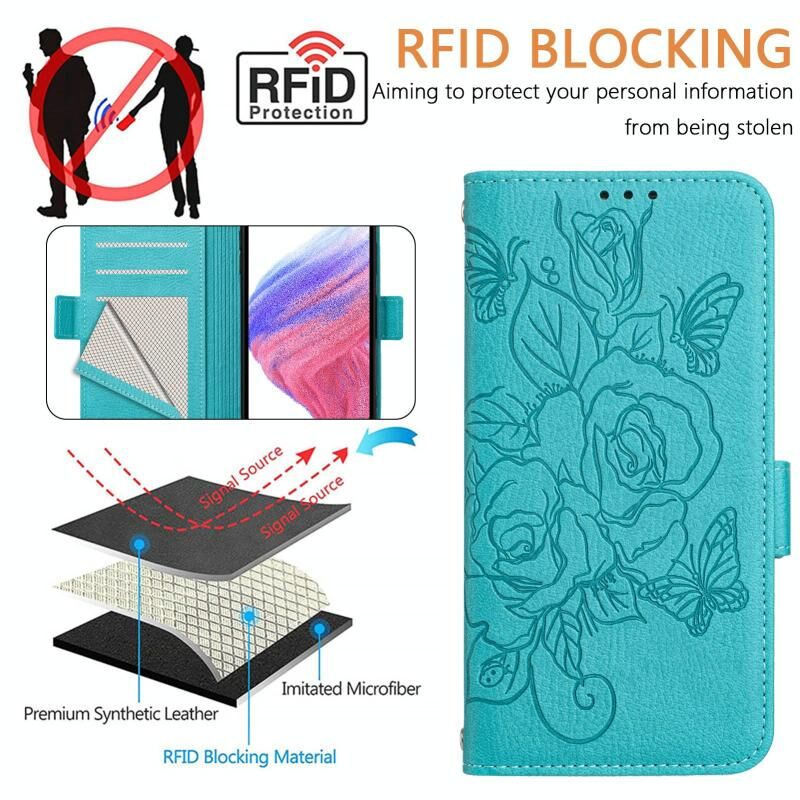 For Samsung Galaxy A07 4G Embossed Rose RFID Anti-theft Leather Phone Case(Light Blue)