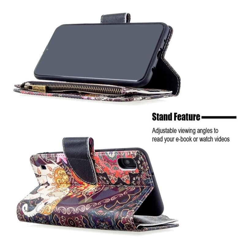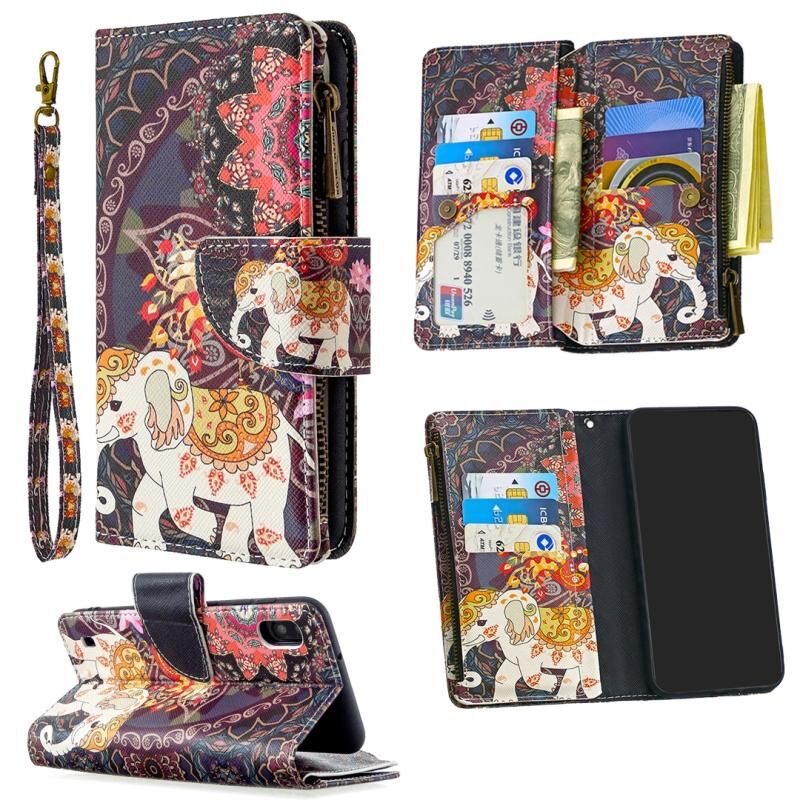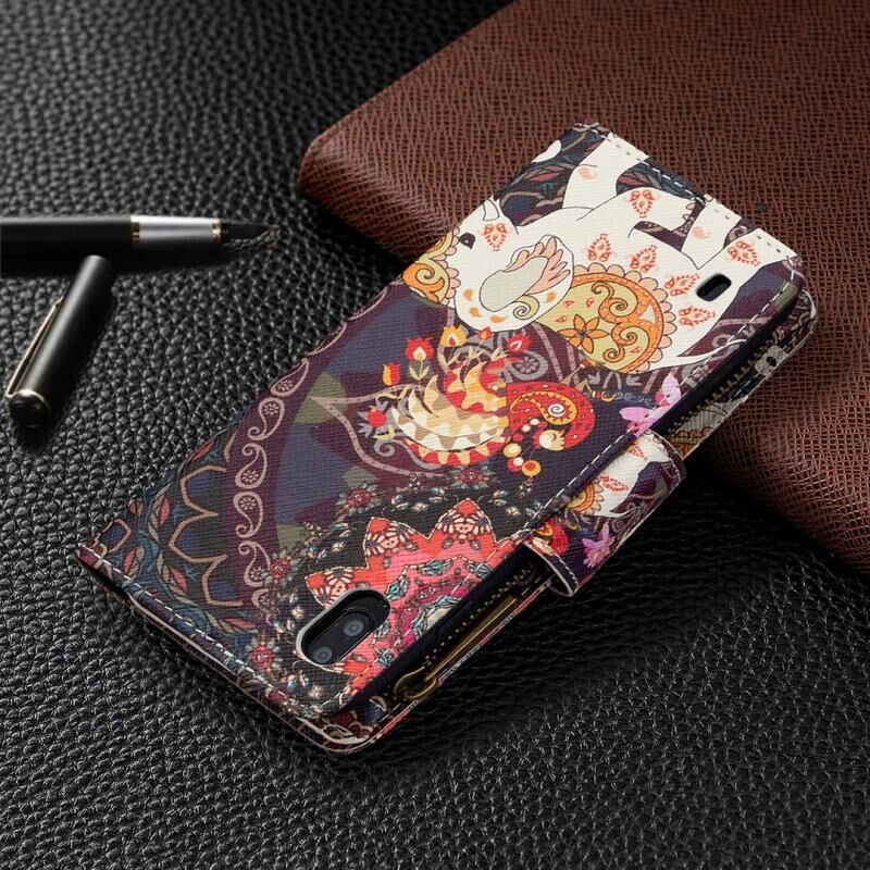 Θήκη Samsung Galaxy A10 Δερμάτινη Οριζόντια με Φερμουάρ, Πολύχρωμο Σχέδιο, με Θήκη & Θήκες Καρτών & Πορτοφόλι (Λουλούδια & Ελέφαντες)