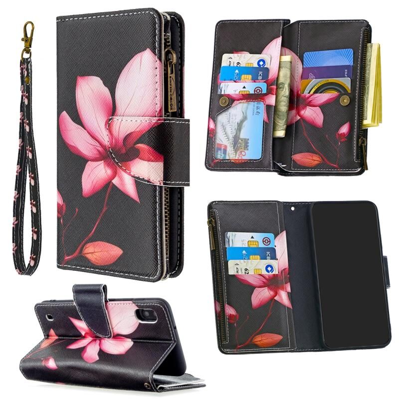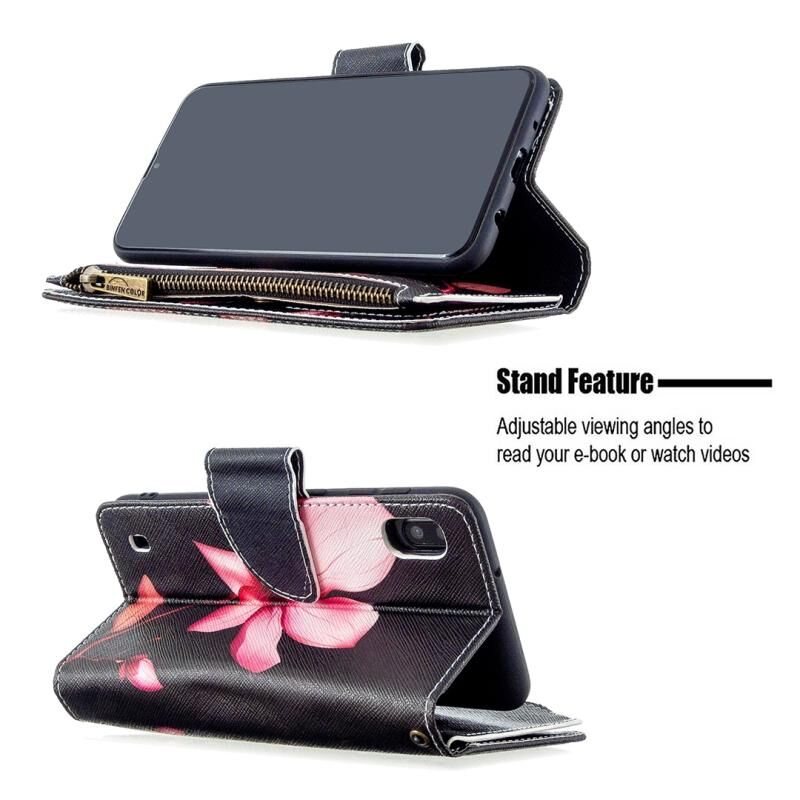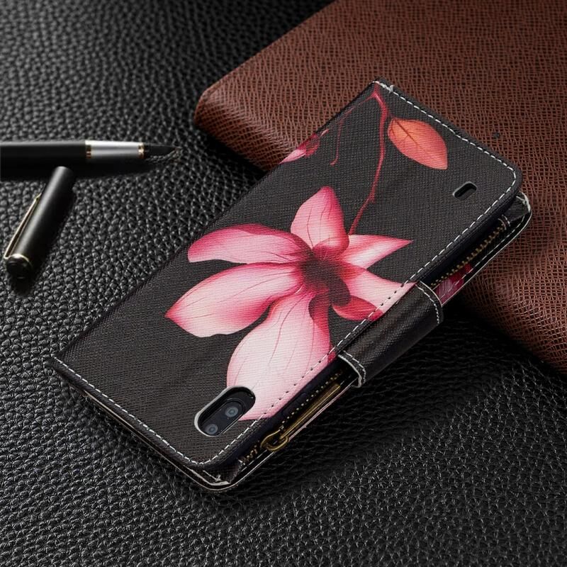 Θήκη Samsung Galaxy A10 Δερμάτινη Οριζόντια με Φερμουάρ, Πολύχρωμο Σχέδιο, με Θήκη & Θήκες Καρτών & Πορτοφόλι (Λωτός)