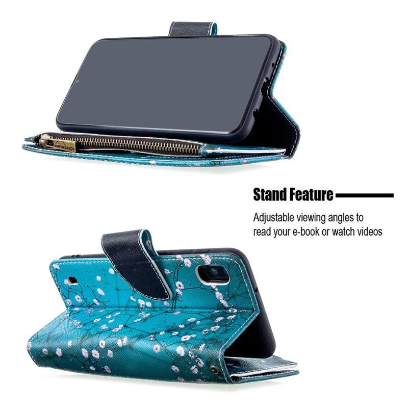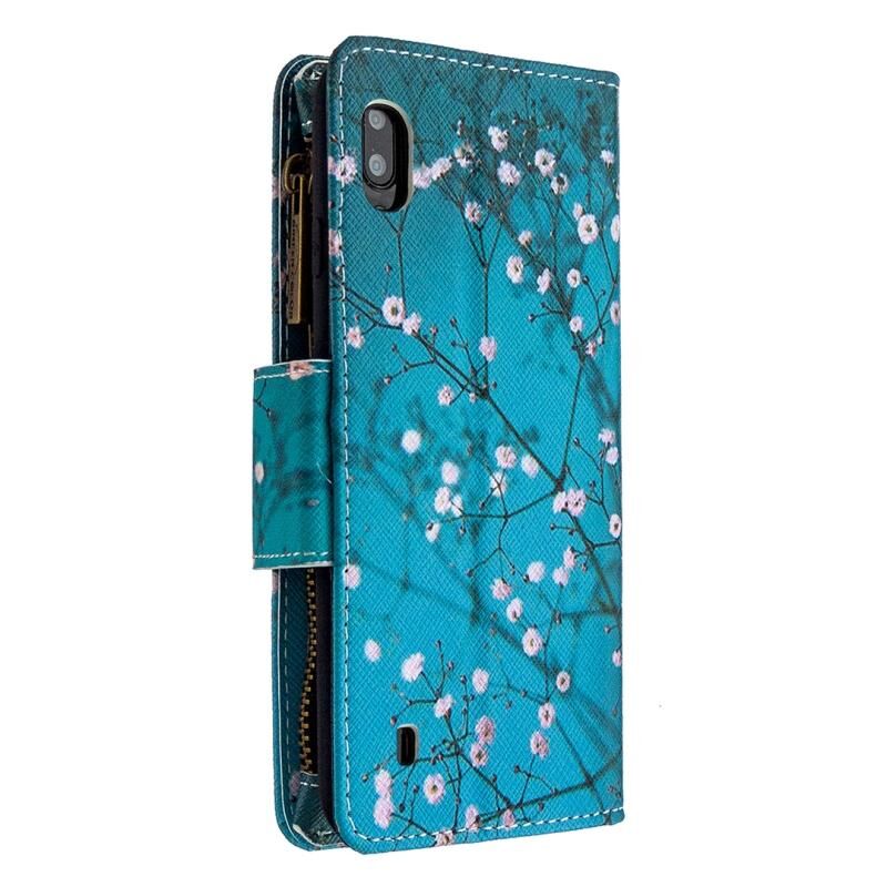 Θήκη Samsung Galaxy A10, Δερμάτινη οριζόντια με φερμουάρ, πολύχρωμο σχέδιο, με βάση & θήκες για κάρτες & πορτοφόλι (Λουλούδι Δαμασκηνιάς)